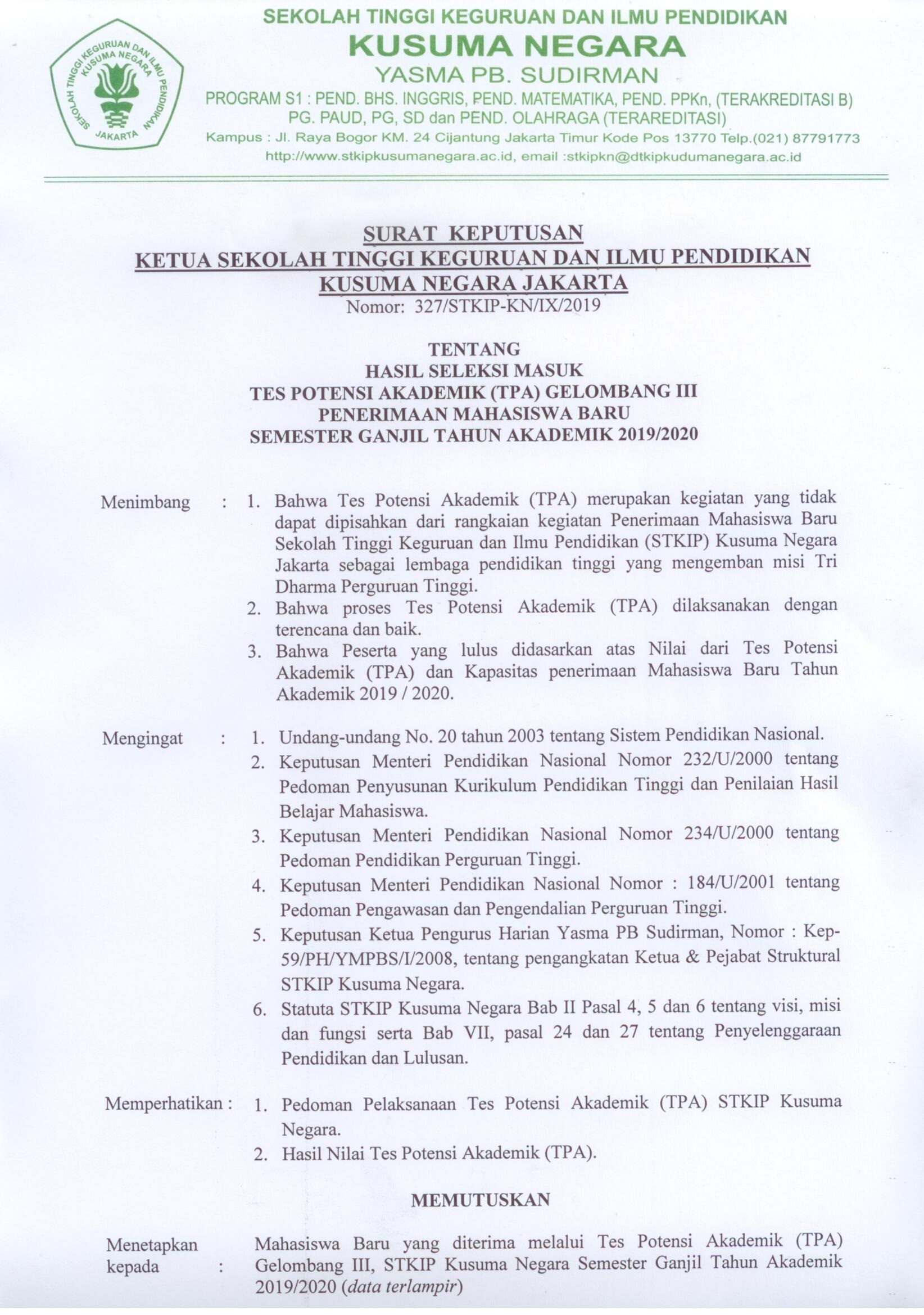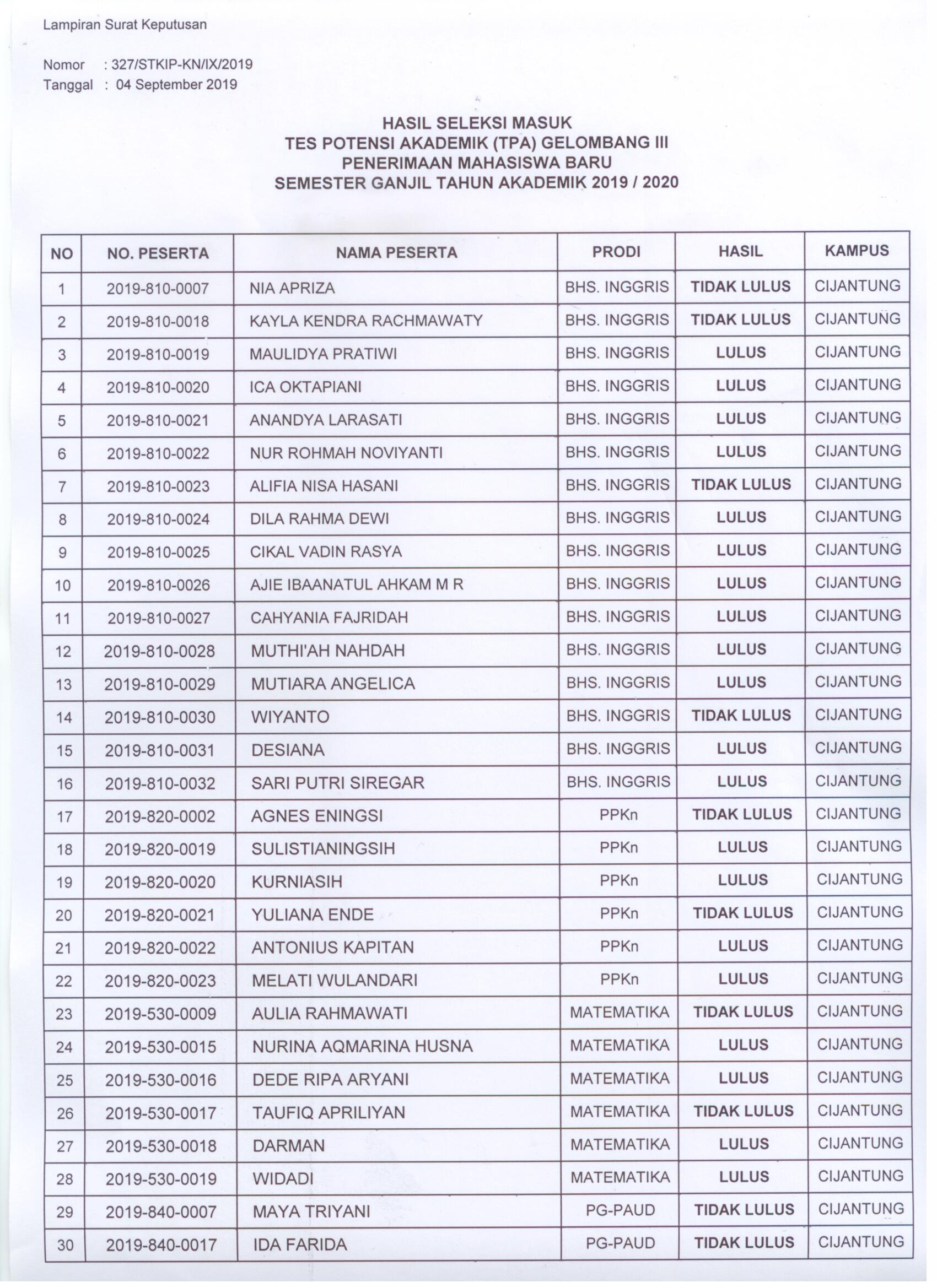 Hasil Seleksi Masuk Tes Potensi Akademik (TPA) Gelombang III Penerimaan Mahasiswa Baru Semester Ganjil Tahun Akademik 2019/2020 Leave a Comment / Berita Kampus, Panitia PMB, Pengumuman / By admin