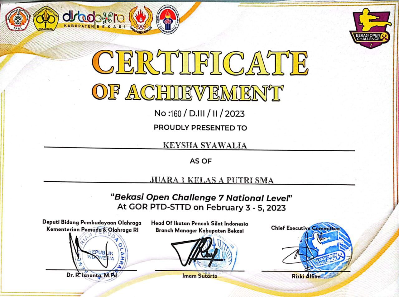 Keysha Syawalia Mahasiswa STKIP Kusuma Negara Program Studi Pendidikan Olah Raga peraih Juara 1 Kelas A Putri SMA. Kegiatan yang dilaksanakan oleh Deputi Bidang Pembudayaan Olahraga Kementerian Pemuda & Olahraga RI, Ikatan Pencak Silat Indonesia dan Chief Executive Committe. Kegiatan dilaksanakan pada 3 Februari s.d. 5 fEBRUARI 2023