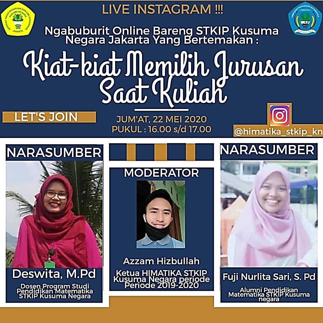 Kegiatan webinar ini diprakasai oleh HIMATIKA atau Himpunan Mahasiswa Matematika STKIP Kusuma Negara yang dilakukan dalam rangka memberikan pemahaman dan wawasan kepada siswa SMA dan yang sederajat saat akan memilih melanjutkan studi. Sehingga lulusan SMA atau SMK tidak salah memilih jurusan hanya karena ikut teman.