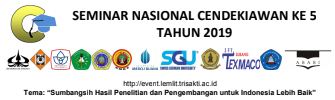 Lembaga Penelitian Universitas Trisakti akan mengadakan Seminar Nasional Cendekiawan ke-5 Tahun 2019 dengan tema “SUMBANGSIH SKRIPSI, TESIS, DISERTASI UNTUK PEMBANGUNAN INDONESIA”. Seminar ini adalah wadah bagi mahasiswa S-1, S-2, dan S-3, mempublikasikan karya ilmiah sehingga dapat memenuhi syarat kelulusan(PERMEN KEMENTERIAN RISET DIKTI NO. 44 TAHUN 2015). Seminar ini dilaksanakan pada tanggal 31 Agustus 2019. Bagi mahasiswa program S-1, S-2, dan S-3 di perguruan tinggi Saudara yang berminat, silahkan unduh informasi selengkapnya pada link di bawah ini