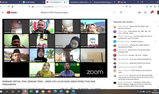 Tridarma Perguruan Tinggi meliputi pengajaran, penelitian, dan pengabdian kepada masyarakat. Pengajaran bagi dosen sudah biasa dilakukan, namun untuk penelitian dan pengabdian kepada masyarakat masih terasa berat untuk dilakukan dosen satu kali setiap semester. Yang umumnya menjadi kendala adalah pendanaan. Oleh sebab itu seminar secara daring ini sangat menginspirasi dosen untuk mencari dana bantuan dari luar STKIP Kusuma Negara. Prodi PPKn STKIP Kusuma Negara memiliki inisiatif yang luar biasa dengan memfasilitasi pengetahuan dosen-dosen Prodi PPKn dalam meraih hibah dengan menyelenggarakan seminar nasional ini. Narasumber sebagai Keynote adalah Guru Besar dari dua kampus ternama di Indonesia yang hampir setiap tahun memperoleh dana hibah Kemenristekdikti, yaitu: Prof. Dr. Abdul Rahmat, S.Sos,I., M.Pd. Guru Besar Univ. Gorontalo, dan Prof. Dr. Hj. Suswandari, M.Pd., Ketua Lemlitbang UHAMKA. Materi yang mereka sampaikan disertakan dengan pengalaman mereka dalam Menyusun proposal dan trik-trik jitu agar lolos Hibah. Pembicara internal Prodi PPKn adalah Dr. Purwani Puji Utami, M.Pd. yang lolos Hibah PDP dua kali dan PkM satu kali tahun 2018 dan 2019. Peserta yang ikut seminar diluar dugaan, mencapai 897 orang, aplikasi zoom meeting tidak dapat menampung seluruhnya, akhirnya sebagian peserta mengikuti secara live melalui youtube pada link: