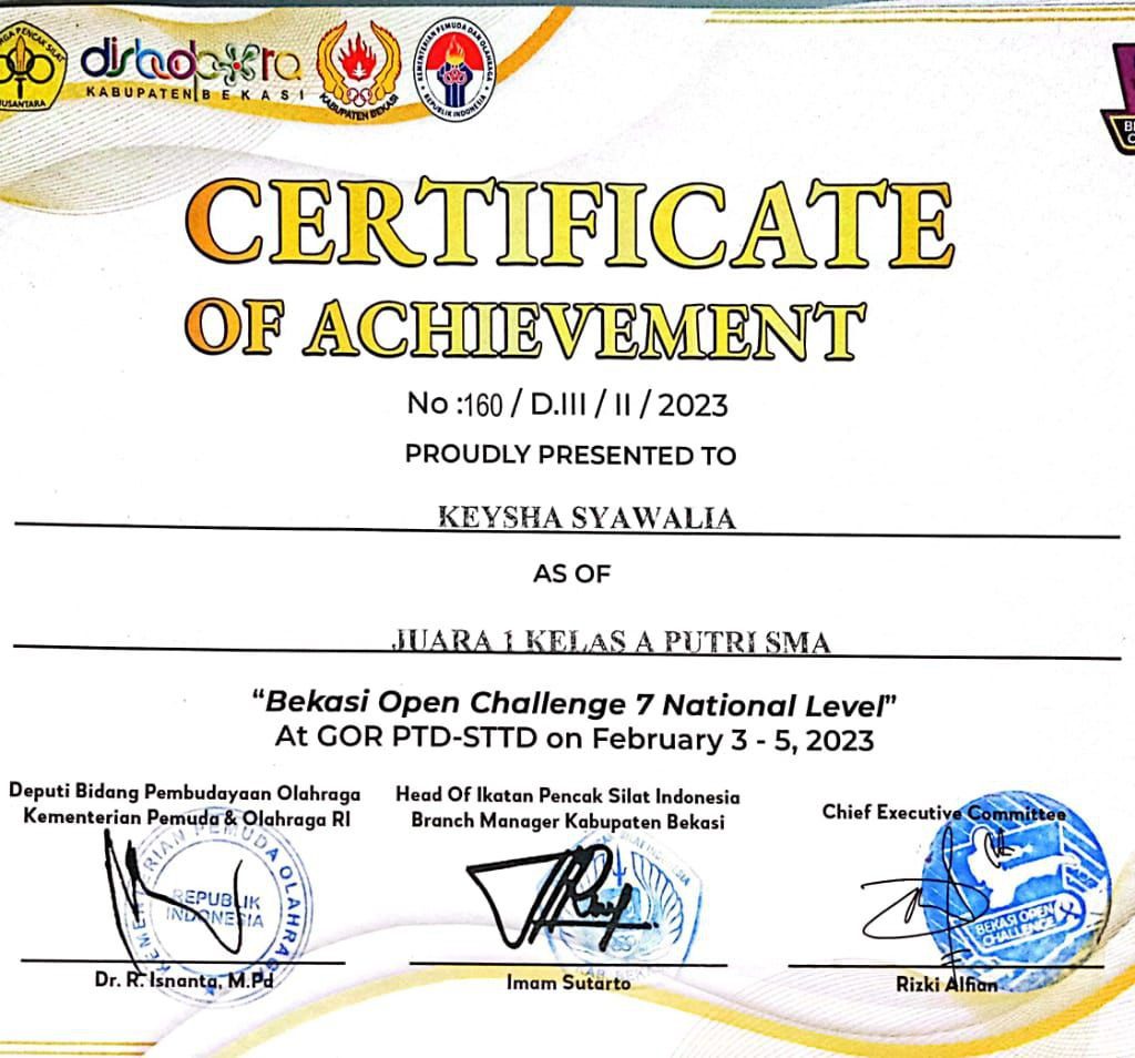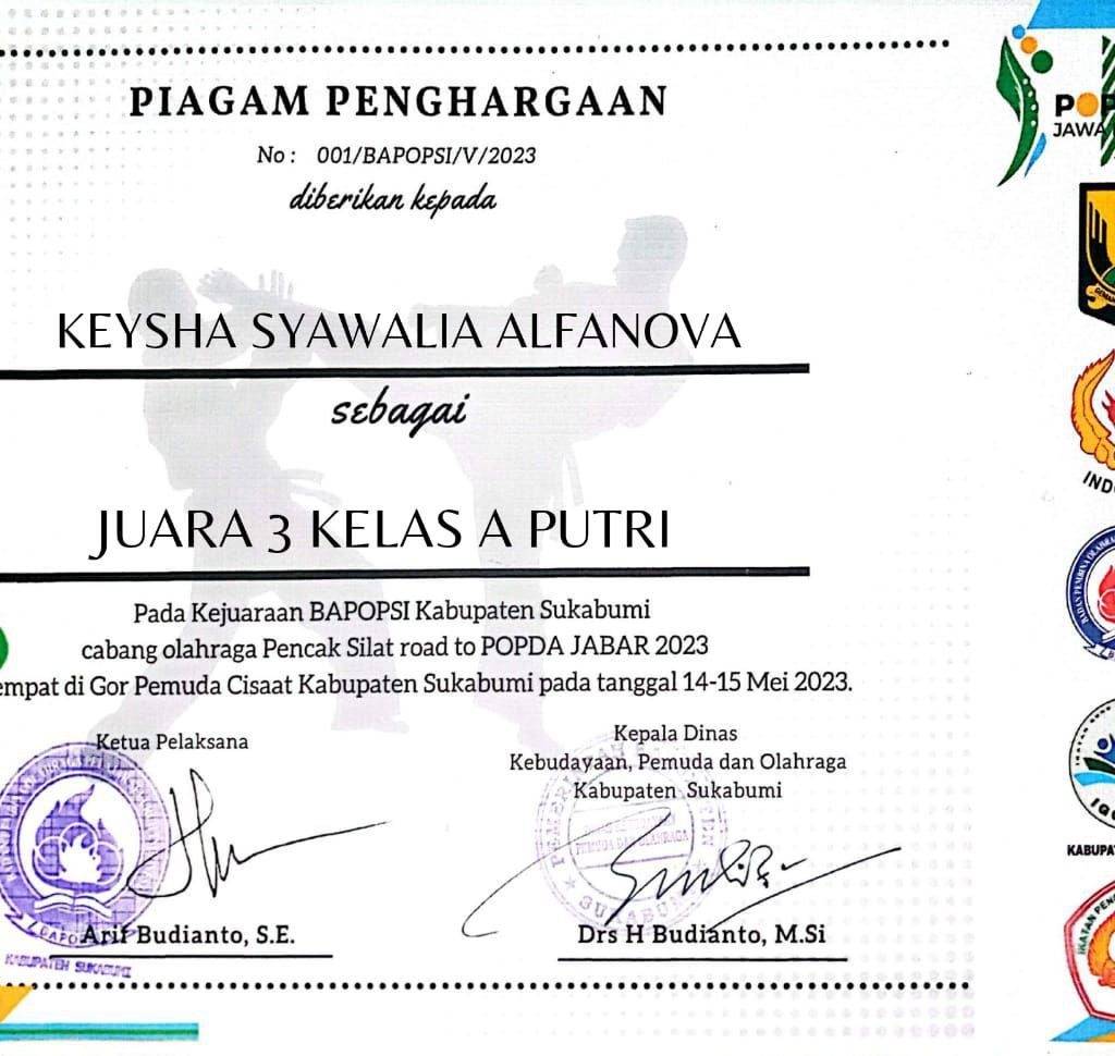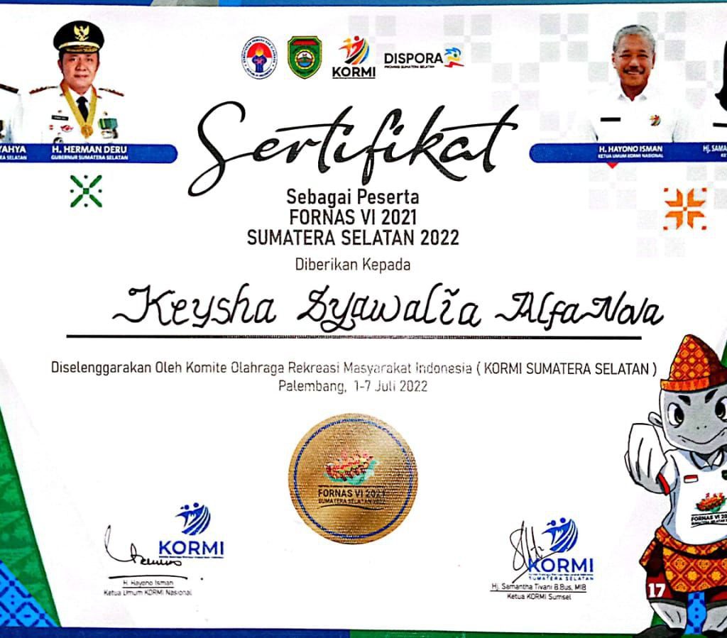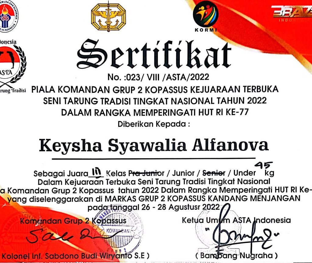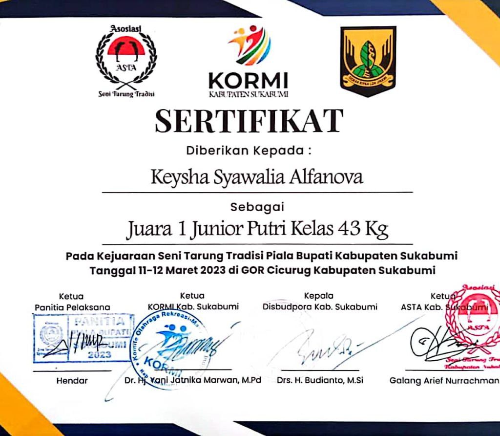 Keysha Syawalia Alfanova, Mahasiswa STKIP Kusuma Negara pada Program Studi Pendidikan Olah Raga sebagai Juara 1 Tarung kelas 45 Kg Putri pada FORPROV IV Jawa Barat cabang INORGA ASTA INDONESIA di GOR H. Dadan (GOR Universitas Sebelas April) Sumedang pada Tanggal 11-12 Juni 2022