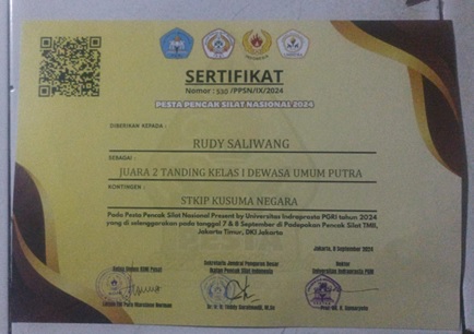 Mahasiswa Program Studi Pendidikan Olahraga STKIP Kusuma Negara atas nama RUDY SALIWANG telah berhasil meraih penghargaan prestasi yaitu juara 2 (PERAK) pada cabang olahraga Pencak Silat Tanding kelas Dewasa Umum Putra antar mahasiswa dalam rangka Kejuaraan Pesta Pencak Silat Nasional Present by Universitas Indraprasta PGRI Tahun 2024 yang di selenggarakan pada tanggal 7 – 8 September di Padepokan Pencak Silat TMII, Jakarta Timur, DKI Jakarta.